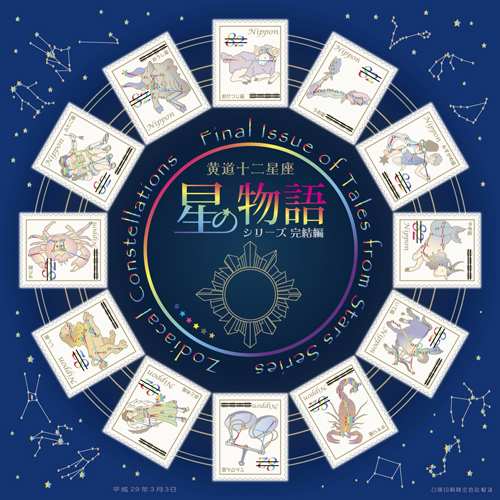 黄道12星座を円形に配置した、12枚1シートの切手です。