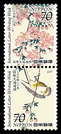 本年は70円郵便切手のデザインに広重の錦絵「しだれ桜に小鳥」(平木浮世絵美術館蔵)を採用しました。風景画家として有名な広重ですが、花鳥画にも優れた作品をたくさん残しています。