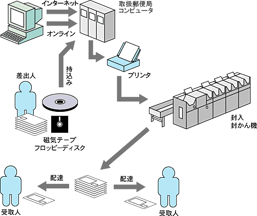 - 郵便物の印刷用データをオンラインまたは電子媒体の持ち込みで郵便局にご提出いただければ、印字から封入・封かんを行い、郵便物を作成します。