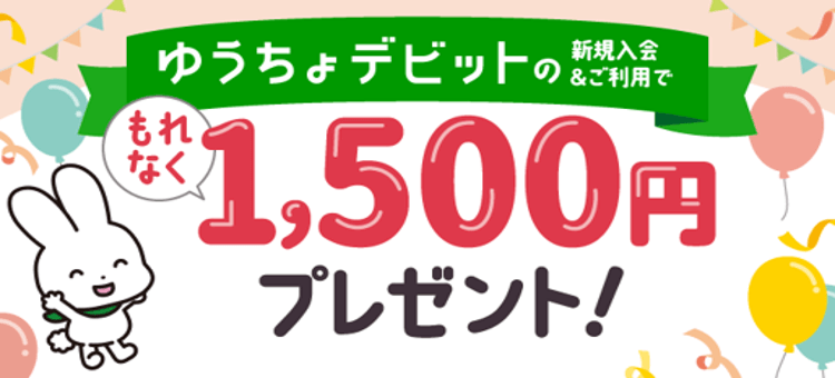 ゆうちょデビットを新規でお申し込みのうえ、お申し込み月の翌月末までに所定の条件を達成された方に、現金1,500円をプレゼント!