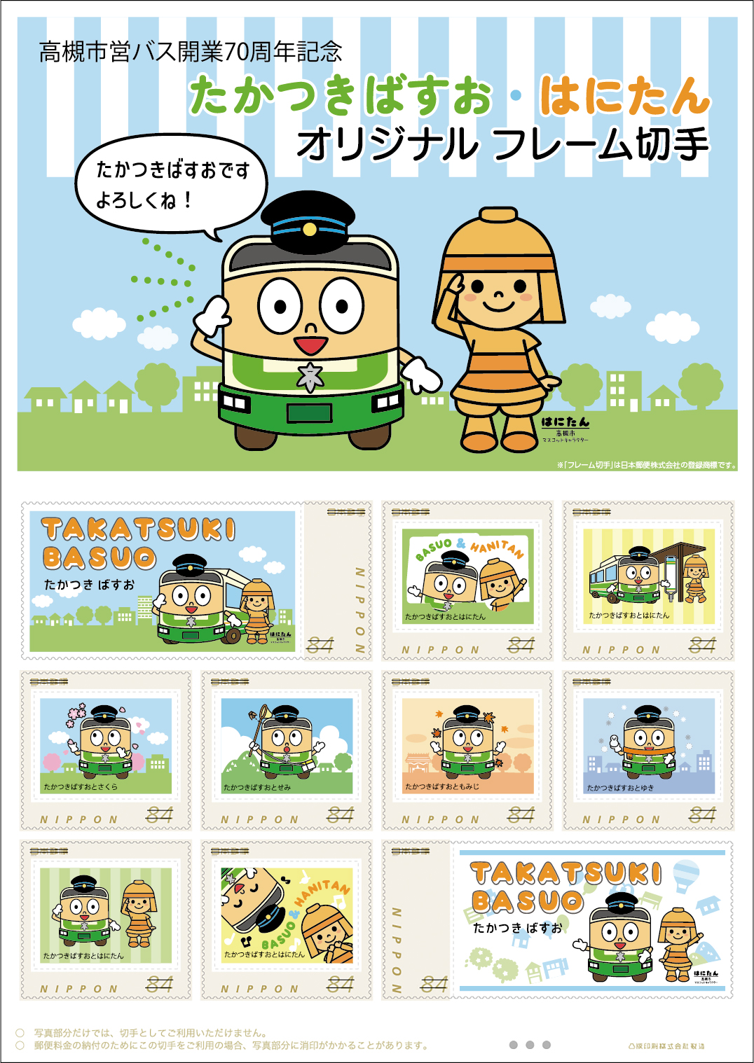 オリジナル フレーム切手『高槻市営バス開業70周年記念 たかつきばすお・はにたん オリジナル フレーム切手』の販売開始