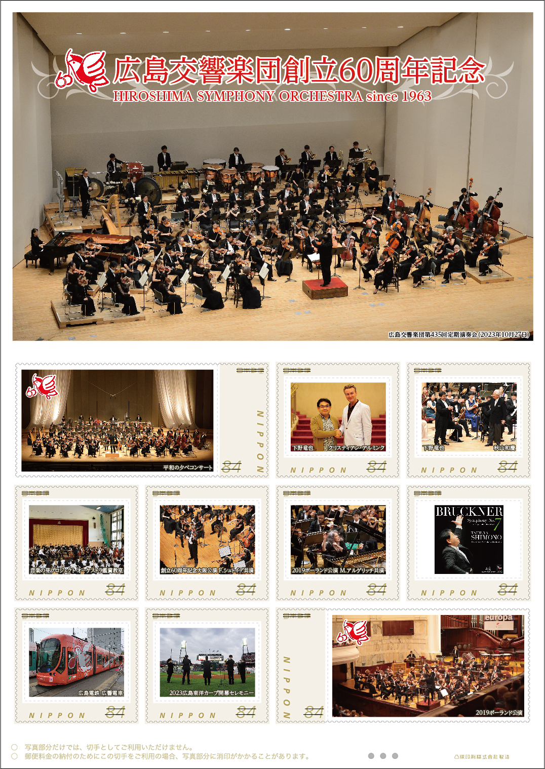 このオリジナル フレーム切手は広島交響楽団の創立60周年を記念して作成したもので、下記の郵便局で限定販売します。
