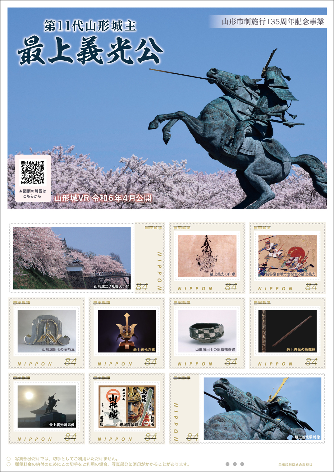このオリジナル フレーム切手は、山形市制135周年を記念して、山形のまちの礎を築いた「最上義光公」や山形城の魅力を伝えることをテーマに作製したもので、下記の郵便局で限定販売します。