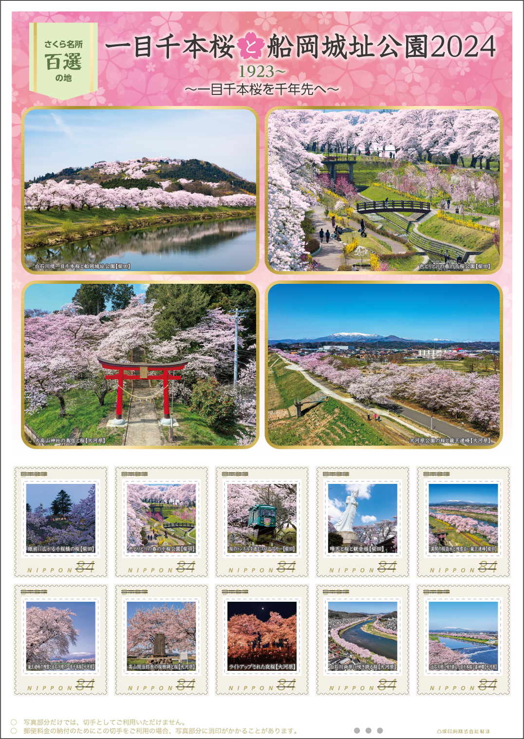 このオリジナル フレーム切手は、さくら名所百選の地に選ばれた日本有数の桜の名所「白石川堤一目千本桜」および「船岡城址公園」を題材に作製したもので、下記の郵便局で限定販売します。