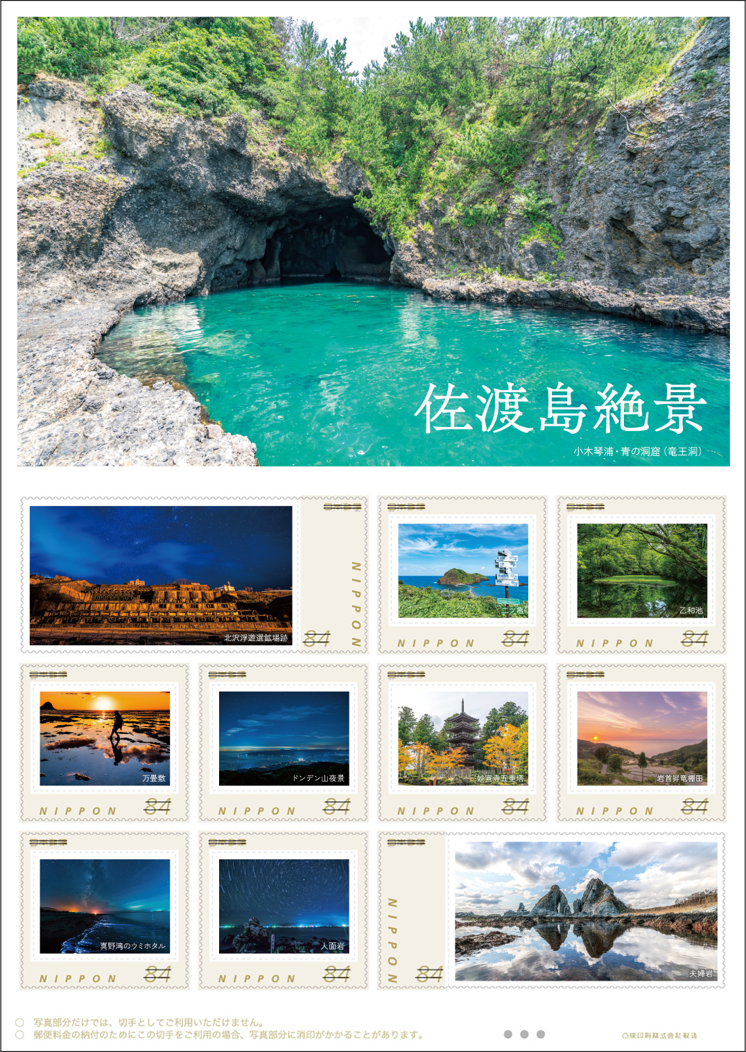 新潟県佐渡島の美しい自然や迫力ある歴史的建造物の写真を使用し、まさに「佐渡島絶景」と呼ぶに相応しいフレーム切手が完成しました。
