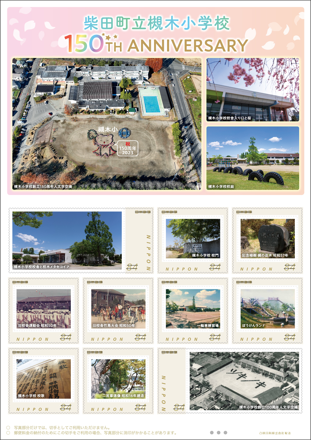 このオリジナル フレーム切手は、柴田町立槻木小学校が2024年6月1日に創立150年を迎えることを記念したもので、下記の郵便局で限定販売します。