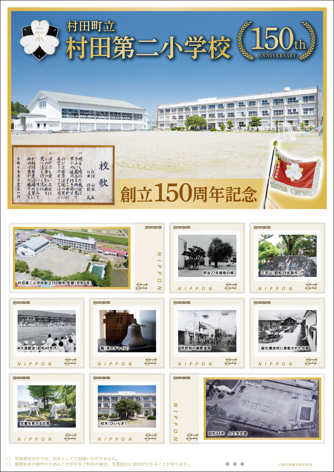 このオリジナル フレーム切手は、村田町立村田第二小学校が創立150周年を迎えたことを記念したもので、下記の郵便局で限定販売します。