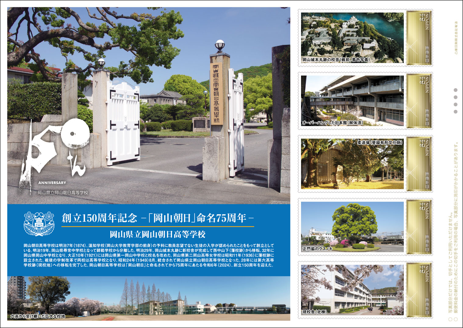 このオリジナル フレーム切手は、岡山県立岡山朝日高等学校が「岡山朝日」と命名されて75周年となる令和6年に創立150周年を迎えたことを記念して作成したもので、下記の郵便局で限定販売します。