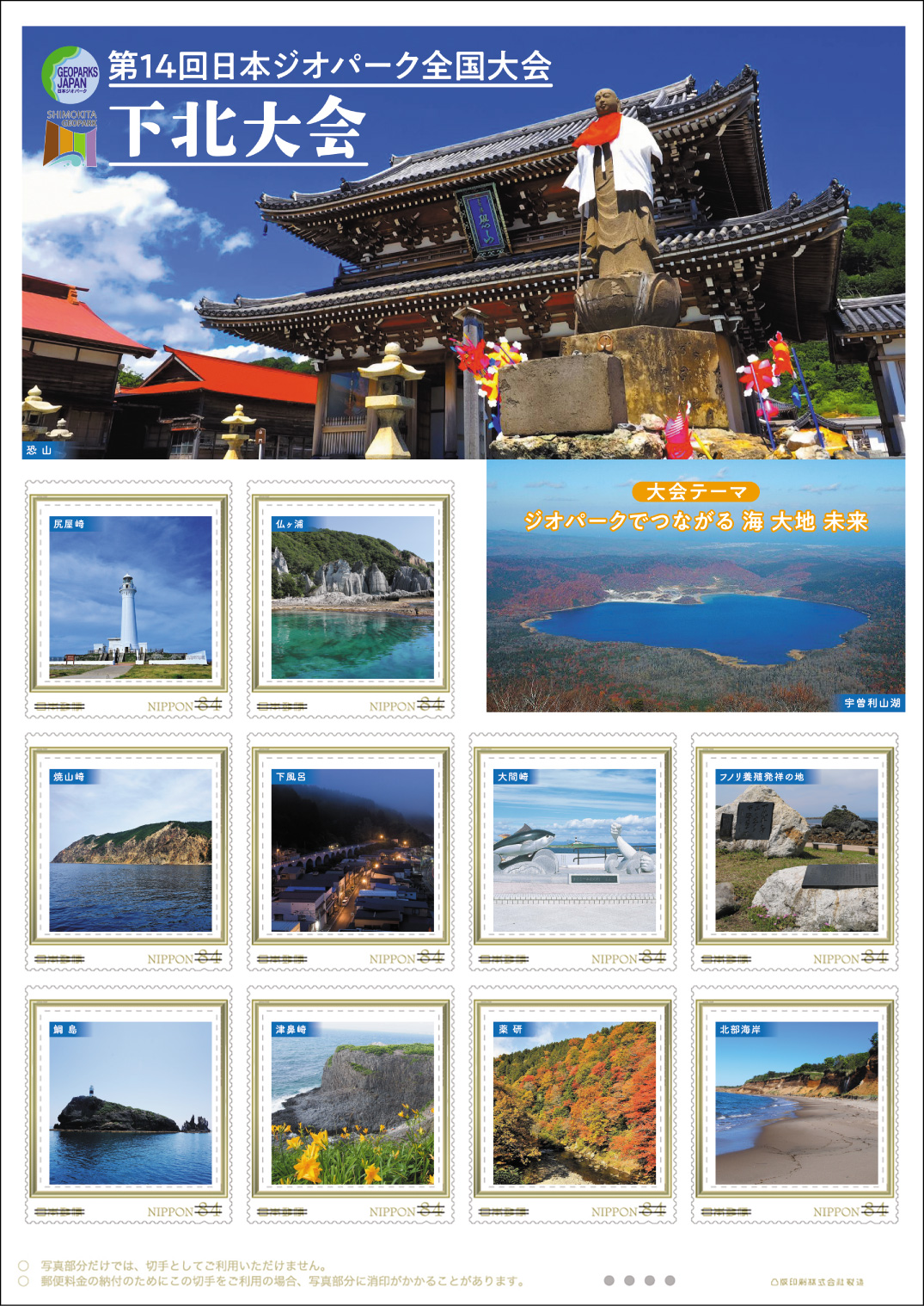 このオリジナル フレーム切手は、第14回日本ジオパーク全国大会下北大会を記念したもので、下記の郵便局で限定販売します。