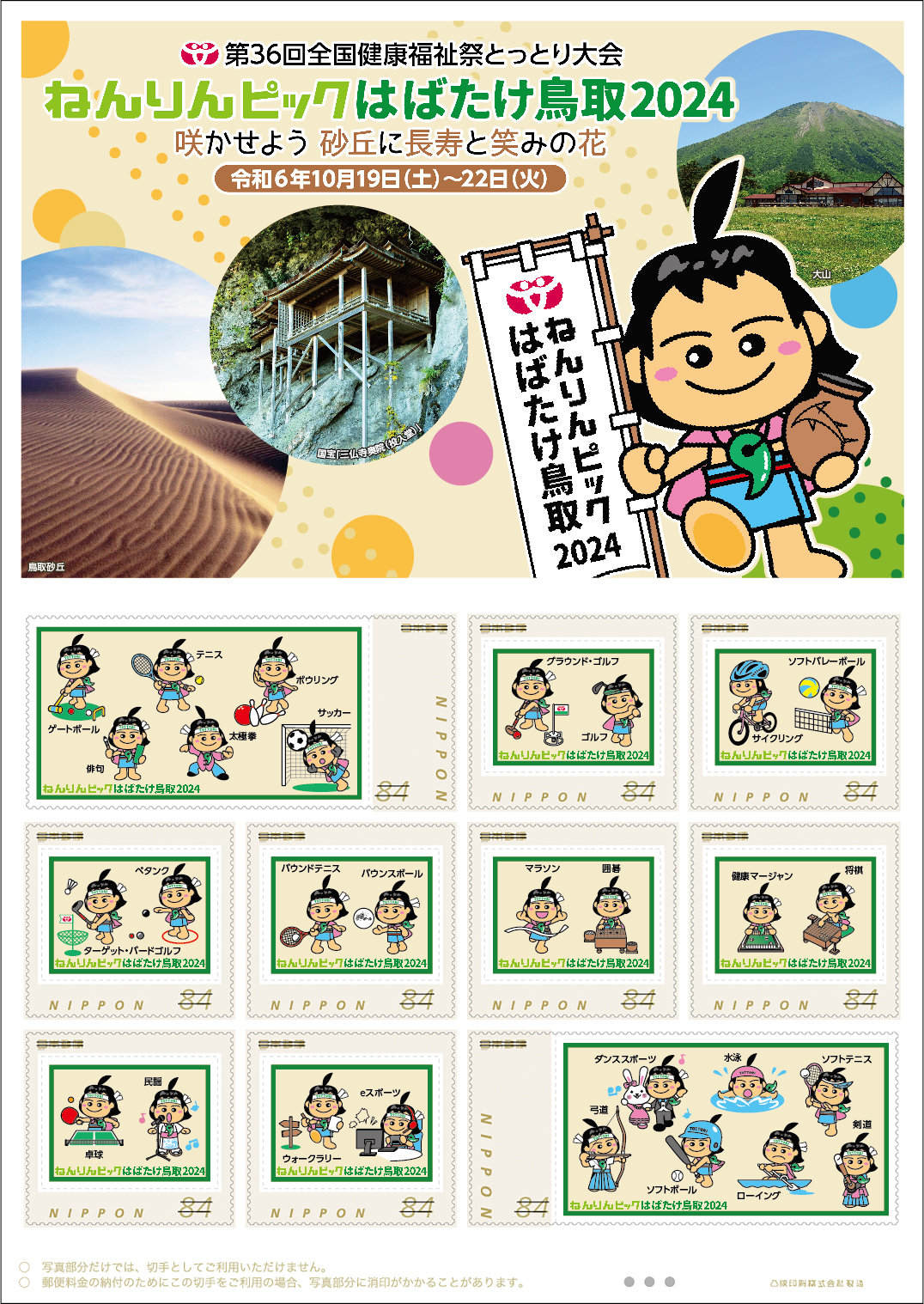 このオリジナル フレーム切手は、第36回全国健康福祉祭とっとり大会(愛称:ねんりんピックはばたけ鳥取2024)の開催を記念して作成したもので、下記の郵便局で限定販売します。