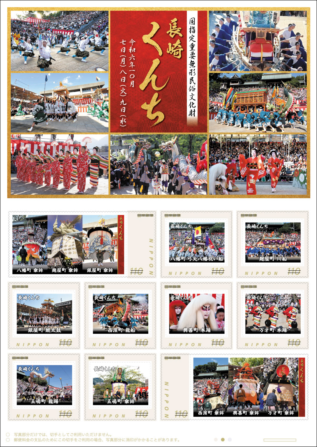 このオリジナル フレーム切手は、「国指定重要無形民俗文化財 長崎くんち」を題材に作成したもので、下記の郵便局で限定販売します。