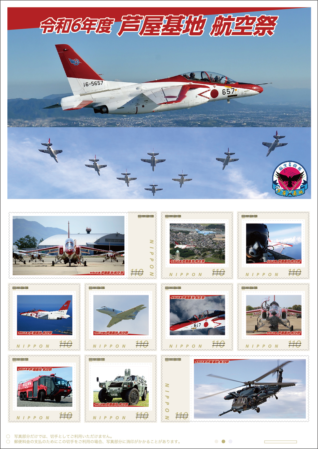 このオリジナル フレーム切手は、「令和6年度 芦屋基地 航空祭」を記念して作成したもので、下記の郵便局で限定販売します。