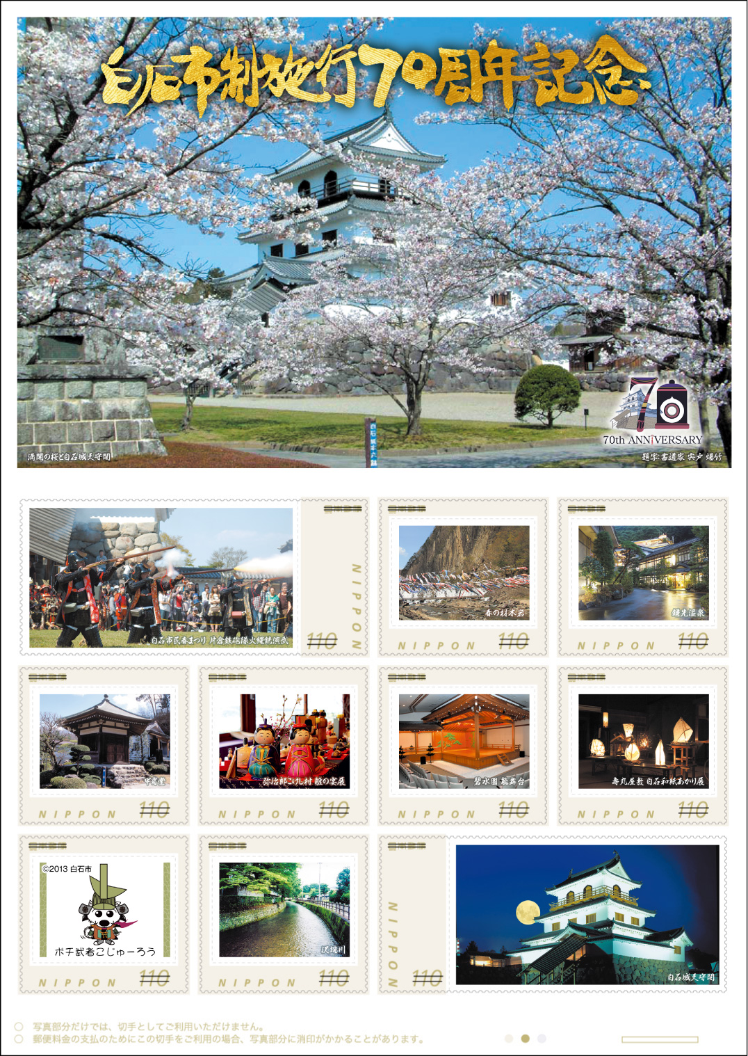 このオリジナル フレーム切手は、白石市の市制施行70周年を記念し、白石市の伝統工芸や観光名所等を題材としたもので、下記の郵便局で限定販売します。