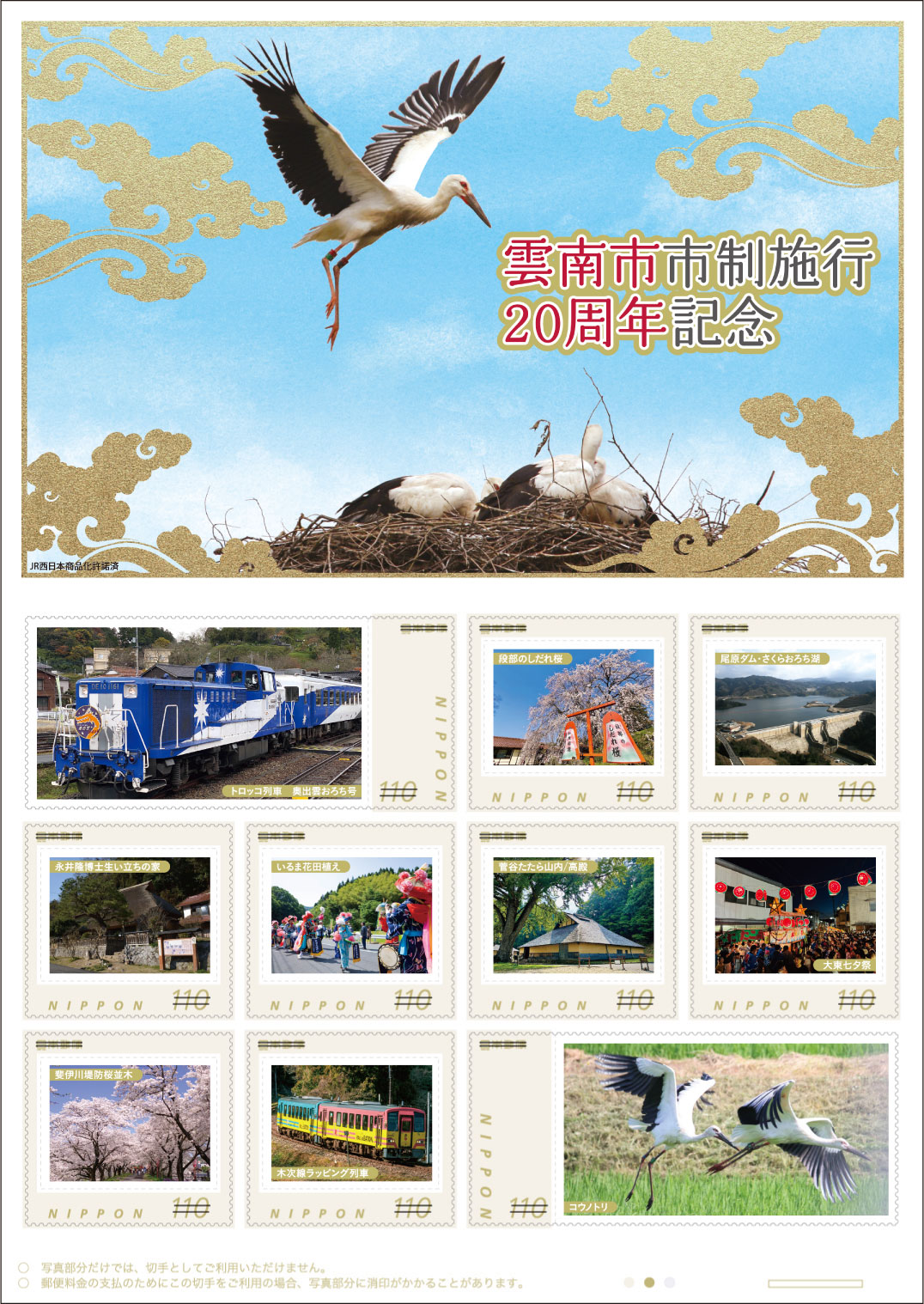 このオリジナル フレーム切手は、島根県雲南市が令和6年11月1日に市制施行20周年を迎えることを記念して作成したもので、下記の郵便局で限定販売します。