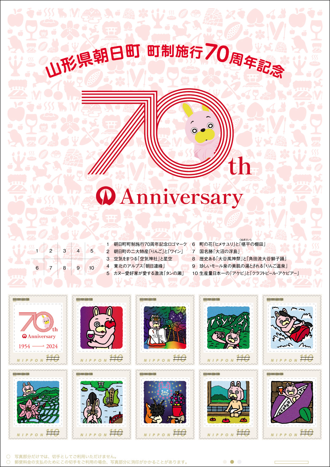 このオリジナル フレーム切手は、朝日町の町制施行70周年を記念して、町の非公式PRキャラクター『桃色ウサヒ』と町の特産品や名所などをデザインしたもので、下記の郵便局で限定販売します。