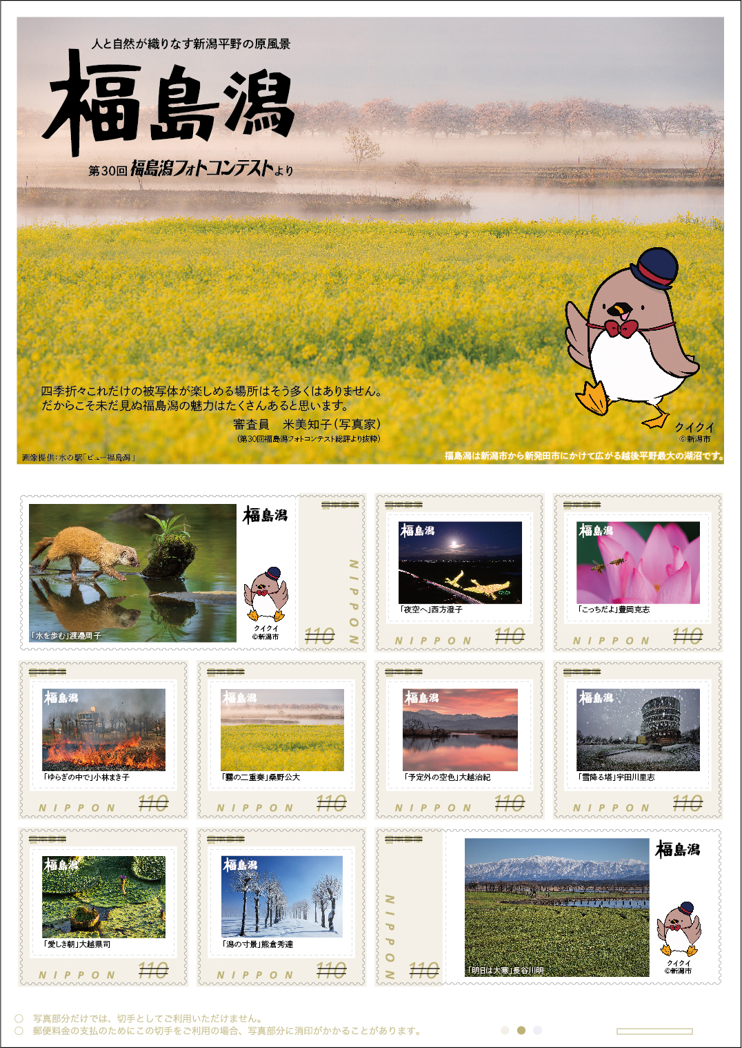新潟市から新発田市にかけて広がる新潟平野にある福島潟。毎年、220種類以上の渡り鳥が飛来し、多くの水生・湿性植物などが450種類以上確認されています。魅力あふれる撮影スポットである福島潟の四季折々の写真をフレーム切手にしました。