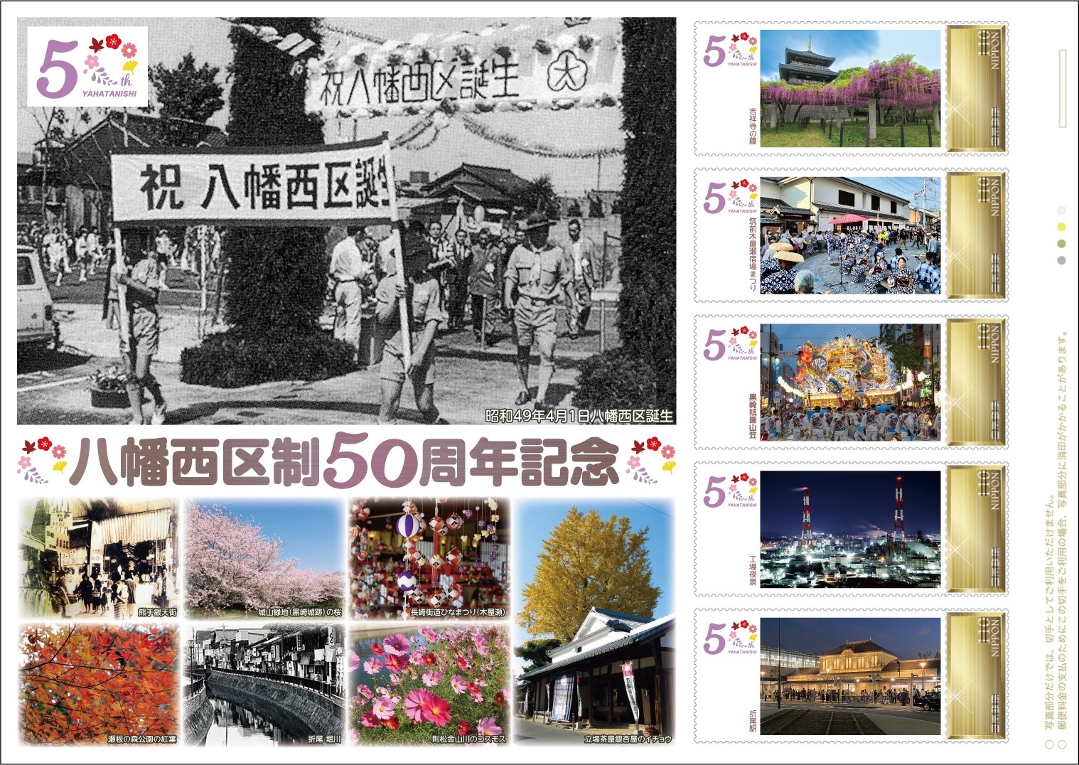 このオリジナル フレーム切手は、「八幡西区制50周年」を記念して作成したもので、下記の郵便局で限定販売します。