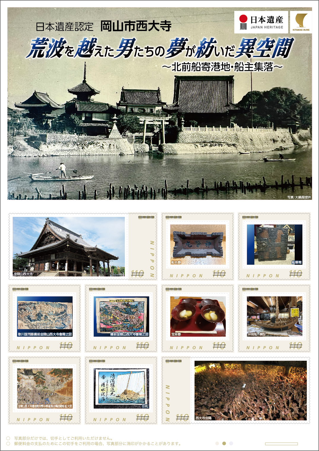 このオリジナル フレーム切手は、日本遺産に追加認定された「荒波を越えた男たちの夢が紡いだ異空間(北前船寄港地・船主集落)」の構成自治体である岡山県岡山市を題材に作成したもので、下記の郵便局で限定販売します。