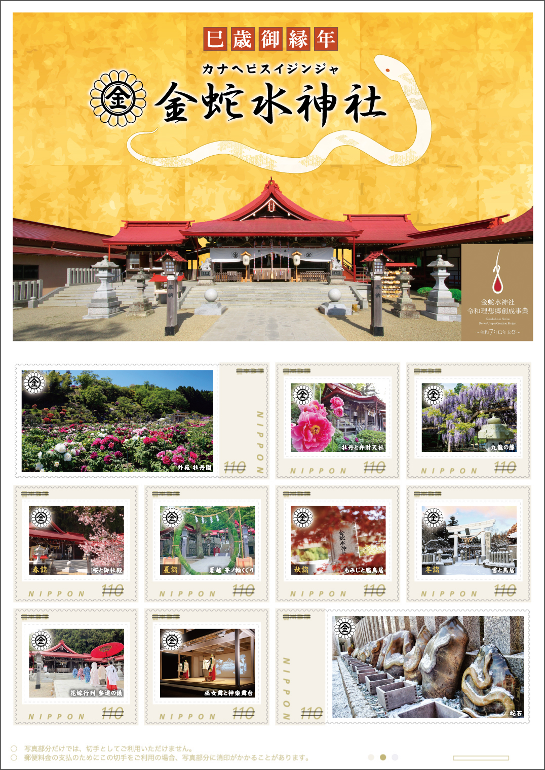このオリジナル フレーム切手は、宮城県岩沼市にある金蛇水神社の四季折々の風景を題材にしたもので、下記の郵便局で限定販売します。