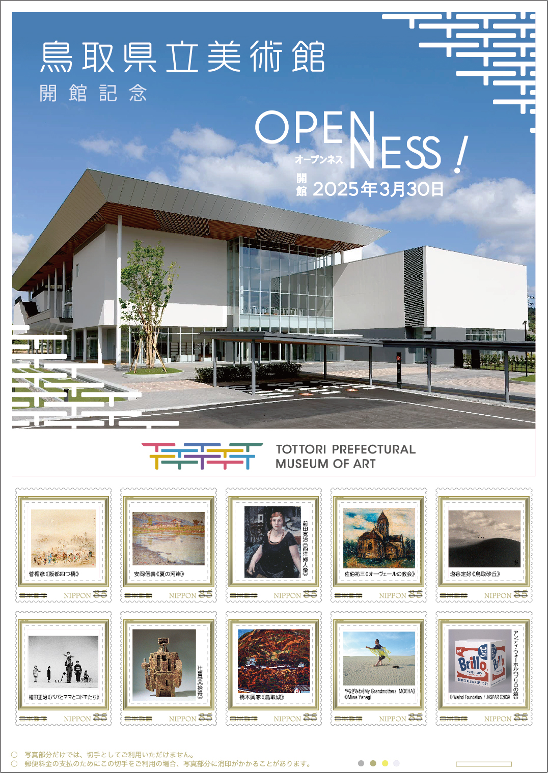 このオリジナル フレーム切手は2025年3月30日に鳥取県立美術館が開館することを記念して作成したもので、下記の郵便局で限定販売します。