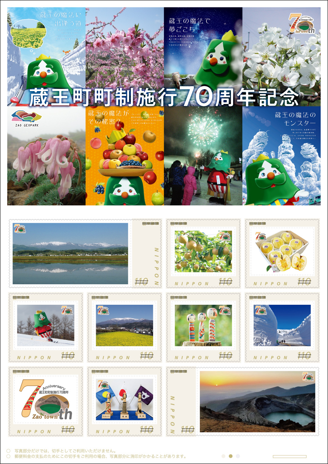 このオリジナル フレーム切手は、蔵王町町制施行70周年を記念し、蔵王町の四季折々の風景を題材に作製したもので、下記の郵便局で限定販売します。