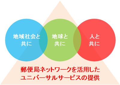 私たちは、郵便・貯金・保険のユニバーサルサービスを安定的かつ質の高いサービスとして維持・強化するとともに、あらゆる事業活動を通じて、以下の各号に取り組んでまいります。