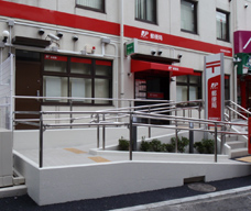 郵便局では、新築店舗において、出入口へのスロープや手すりの設置、視覚障がい者用点字誘導ブロックの敷設などバリアフリー対策を行っています。