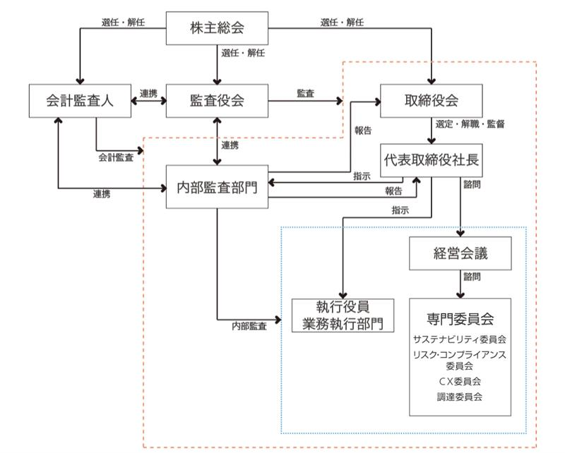 当社は、社外取締役6名を含む取締役10名で取締役会を構成しております。また、迅速な意思決定および業務執行を目的として執行役員制度を導入し、その執行役員の一部をもって構成する経営会議を設置し、経営上の重要事項について協議しております。さらに、経営会議の諮問機関として4つの専門委員会(サステナビリティ委員会、リスク・コンプライアンス委員会、CX委員会、調達委員会)を設置し、議論の専門性を高めております。