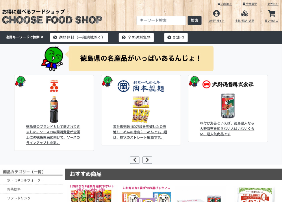 丸忠笠井海産さまの楽天モール内店舗ページ。トップ画面から徳島の選び抜かれた名産品が並ぶ。