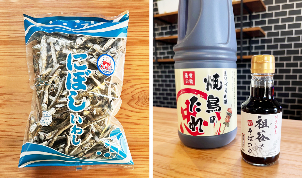 同社の代表商品写真左から伊吹いりこの「にぼしいわし」、「焼鳥のたれ」、「祖谷のそばつゆ」