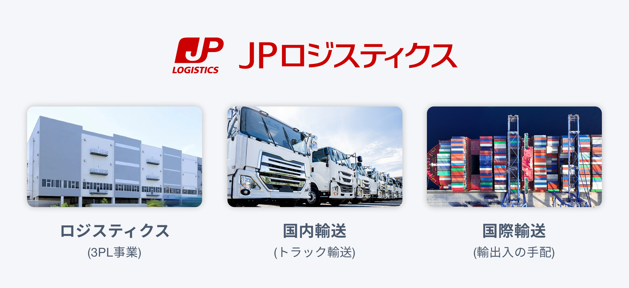 多数の拠点を駆使した「ゆうパック」などの国内配送はもちろん、グループ会社のJPロジスティクスと協業して大きな荷物や国際物流も展開しています。