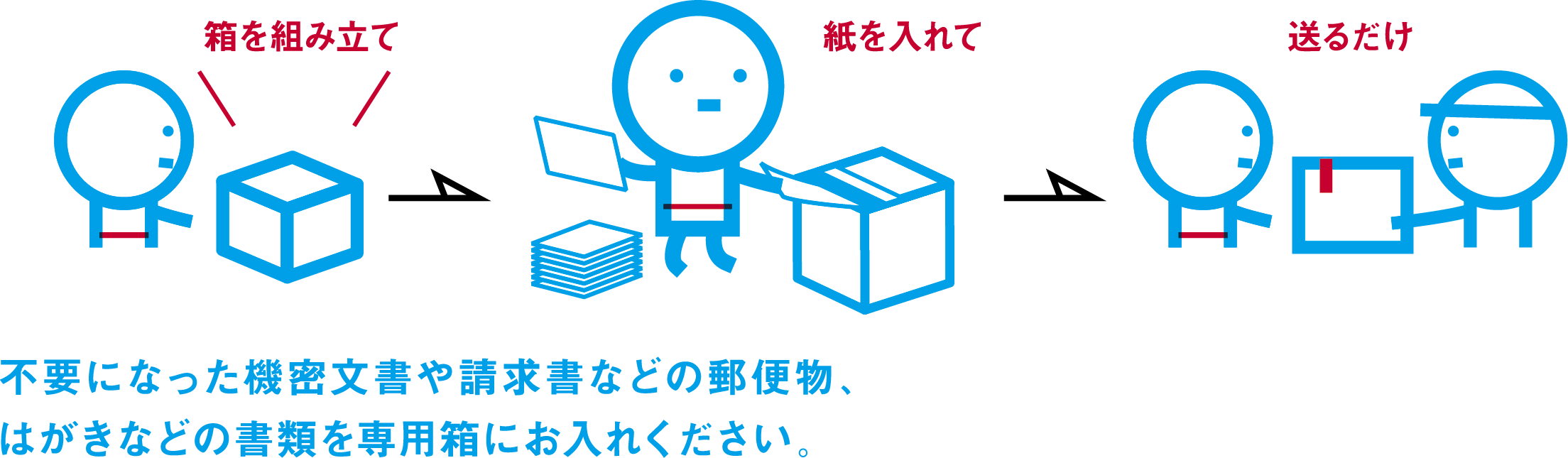 株式会社アインホールディングスさまの事例のとおり、機密文書の廃棄には、日本郵便の機密文書溶解サービスがおすすめです。箱の提供から回収まで一気通貫で対応します。