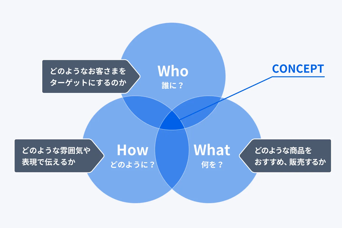 コンセプトはネットショップを含むすべての施策の軸となるものです。各施策において一貫性を持たせ、差別化ポイントを創出するためには「どんな人に」、「どんな商品を」、「どのように」販売するのかを明確にする必要があります。