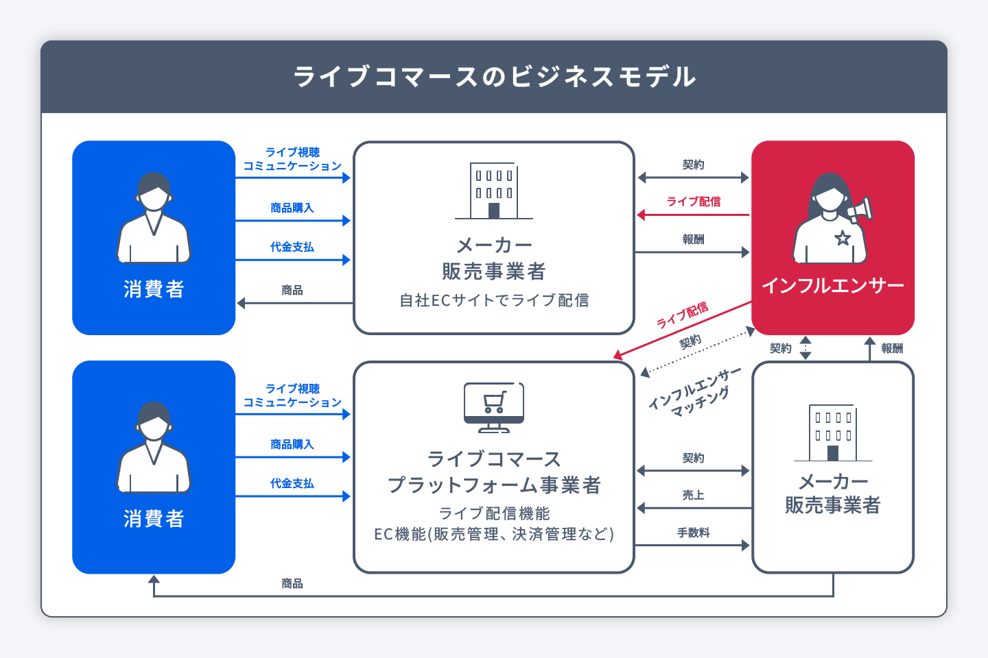 また、直近では、ライブコマースプラットフォーム事業者や広告代理店等が、ライブコマースを実施したいメーカーとインフルエンサーとのマッチングを行い、契約もライブコマースプラットフォーム事業者や広告代理店等とそれぞれで行うサービスもあります。(直接契約しない。)