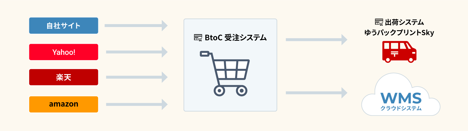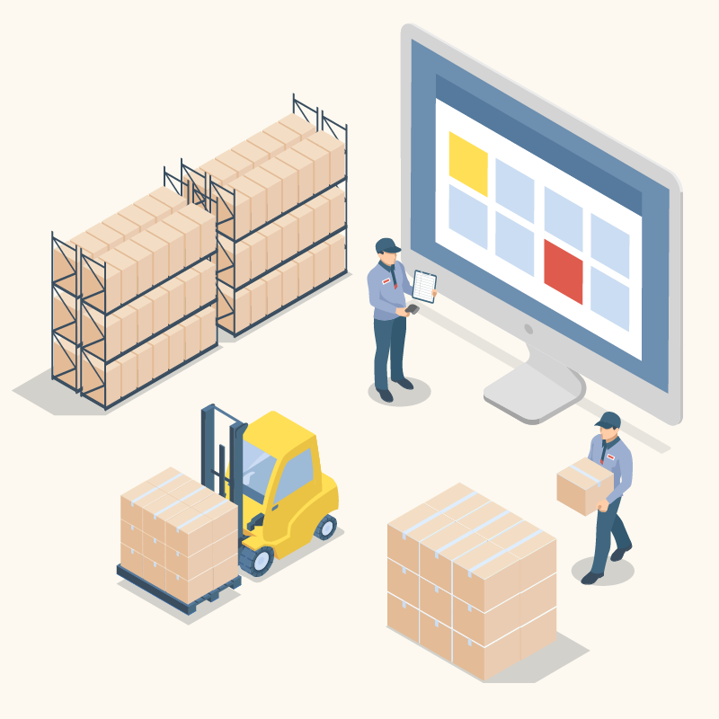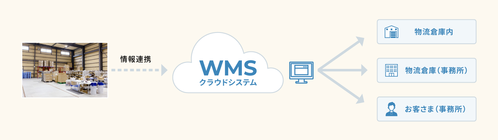 日本郵便の倉庫管理システム(WMS)を活用し、お預かりした商品は全てデータベースに登録。クラウド上のため物流倉庫内、物流倉庫の事務所やお客さまの事務所など、通信環境があればどこでもリアルタイムで在庫や作業状況が把握できます。