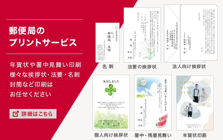 切手・はがき・レターパックなど、送るために必要な商品をご紹介しています。ご購入は郵便局の窓口や各リンク先の郵便局のネットショップページよりご覧ください。