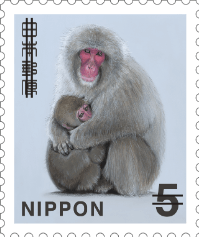 | コメント | 「5円普通切手(ニホンザル)」は、2014~2015年の『普通切手全面刷新』の際、発行されました。 題材についてはアンケート調査を行い、全体テーマは「日本の自然」、低額面は動物、中額面は花、高額面は景観、さらに、具体的な動物などを決めていきました。 全面刷新ですので、ひとつの原画にあまり時間をかけられませんでしたが、ニホンザルの原画は、監修者からのご指摘で、描き直した思い出深い作品です。 |