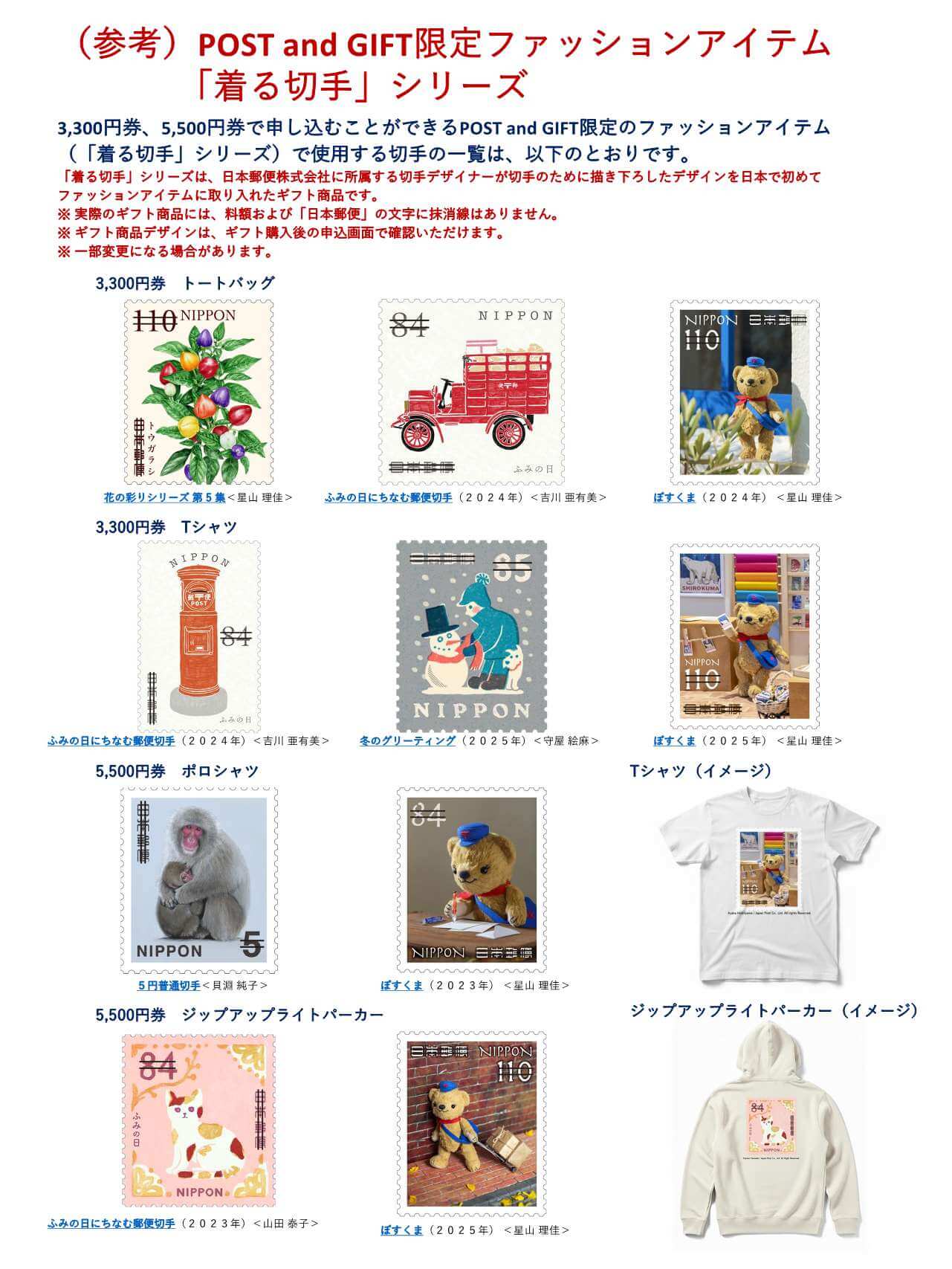 3,300円券、5,500円券で申し込むことができるPOST and GIFT限定のファッションアイテム(「着る切手」シリーズ)で使用する切手の一覧は、以下のとおりです。