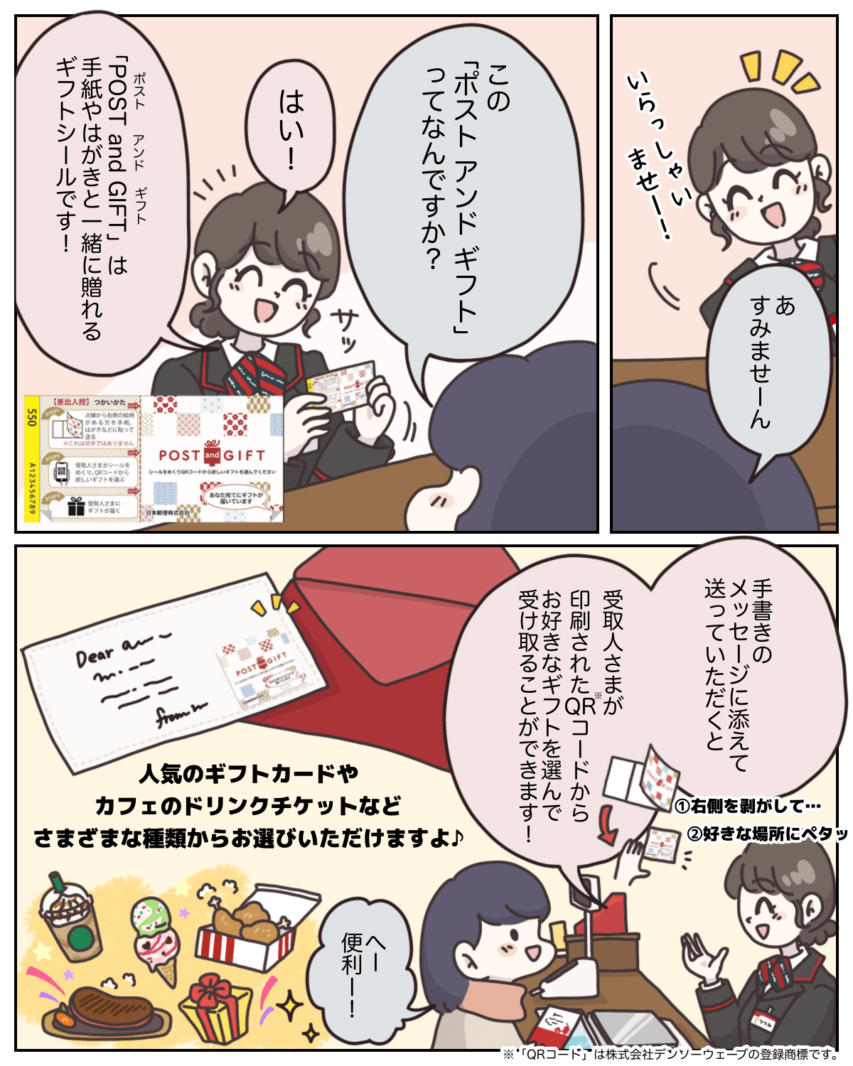 - POST and GIFTのQRコード及びURLの表示に印字不良があった場合は、郵便局にお申し出ください。