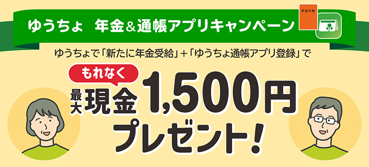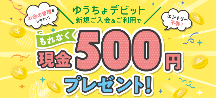 ゆうちょデビットをお申し込みのうえ、お申し込み月の翌月末までに、ゆうちょデビットを3回以上、かつ合計5,000円(税込)以上ご利用いただいたお客さまへ、もれなく現金500円をプレゼント。