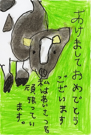 青々とした牧草が広がっているのでしょうか。牛がぬっと現れたように画面の外から顔をのぞかせています。牛の切り取り方が絶妙なので、「あけましておめでとうございます私はあいさつを頑張っています。」という年賀状の書き手の言葉は、描かれた牛の科白のようにも重なりあって見えます。牛の輪郭や文字は素朴に見えますが、一方で模様のグレーにはぼかしが使われて細やかな配慮がうかがわれます。シンプルですが力強いメッセージが伝わってくる画面です。
