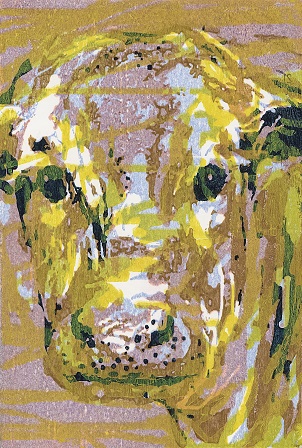 牛の顔を画面全体に入れている構図がとてもインパクトのある作品です。 黒色、グレー、黄色、茶色の線が重なって出来上がっていて、それぞれの線の色味を感じる透明度で重なりあい、それが更に色数を複雑化して作品の軽やかさとリズムを生み出しているように思います。大胆な牛の顔を狙い通りに表現されていて、あどけない牛の表情をしっかりと捉えられており、見るたびに目が合って笑顔になってしまいます。