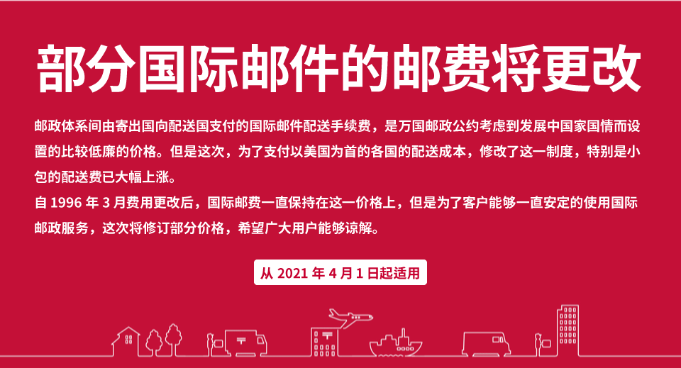 在国际邮件的邮费中包含了各国的邮政体系间由寄出国向配送国支付的国际邮件配送手续费。以前,该配送手续费根据万国邮政公约的规定,考虑到发展中国家国情而设置的比较低廉,但是在2019年的万国邮联临时大会上,对各国设定的国际邮件配送手续费公约进行了修订,相应费用大幅上涨。因此,为了适当弥补对各国支付的配送费用的增加部分,我司也将更改国际邮费。