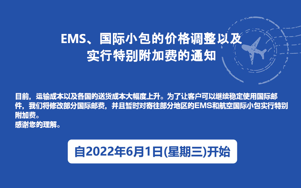 2022年6月1日起,除EMS外,新增国际小包(限航空邮件)将实行特别附加费(限第3地带和第4地带),并努力确保装载邮件的空间。