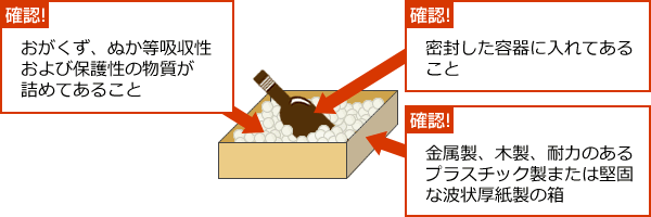 - 各容器は、破損した場合に液体を吸収するため適当な保護材を詰めた特製の堅固な箱に入れてあること。