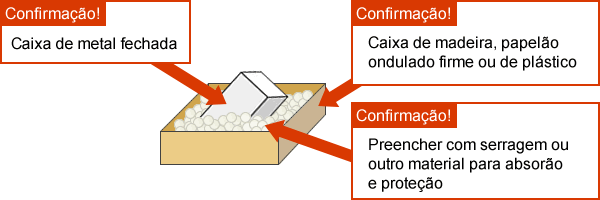 - Assegure-se que possua material de amortecimento suficiente para impedir que o conteúdo interno se mova dentro da embalagem devido aos choques durante o seu transporte, entre outros. Além disso, atente-se para que os choques externos não causem danos ao conteúdo.