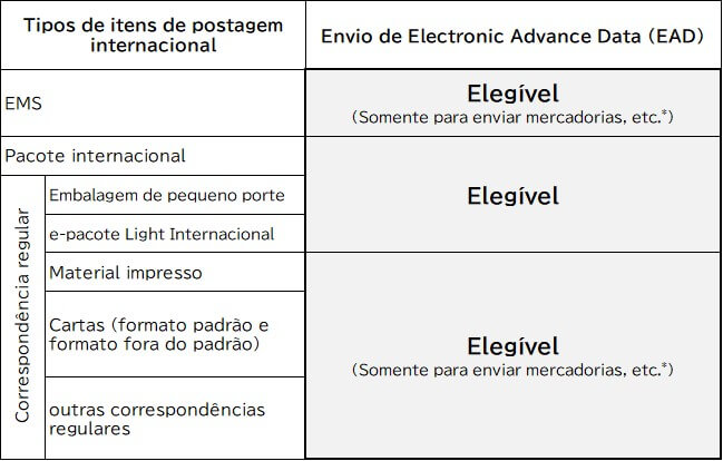 - A partir de 22 de setembro de 2023 (sexta-feira), recomendamos que informações como os códigos HS dos itens de conteúdo sejam enviados como Electronic Advance Data (EAD) ao enviar encomendas para alguns países/regiões da Europa (Estados-Membros da UE, etc.). O não envio dessas informações ou o envio de informações incorretas pode resultar no atraso ou na devolução dos itens postais, conforme determinado pelas autoridades alfandegárias do país/região de destino. Verifique mais informações por aqui. (edição em Inglês)