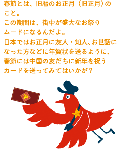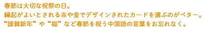 中国や台湾では、日本と違い、旧暦の正月を1年で最もおめでたい期間、「春節」 として盛大に祝います。(※旧暦のお正月は、その年によって元日が異なります。) 旧暦の大晦日の夜は午前0時をピークに爆竹が鳴り響き、お正月中は家族や友人で集まり食事をしたり、「廟会」と呼ばれるお寺の縁日に出かけるなど、思い思いの楽しい時間を過ごします。 また、日本と同様、新年のあいさつをカードで送る習慣があります。送るカードとしては切り絵や、赤や金色を使ったカラフルなものが好まれ、中国や台湾の郵便局でも年賀用のグリーティングカードを販売しています。台湾では日本と同じような「くじ付きの年賀はがき」も販売されています。