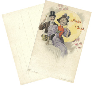 こちらは、ドイツのライプチヒの出版社から発行された1893年の年賀状です。ヨーロッパの初期の絵はがきの香りが漂う逸品です。