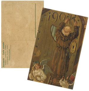 1907年の年賀状です。聖職者が、天使に手伝ってもらって年号の掛け替えをしています。左下の天使が、「6」の数字をもっています。